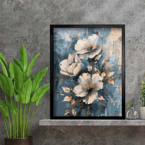 Abstrakcyjna kompozycja białych kwiatów na niebieskim tle przyciąga wzrok swoją lekkością i spokojem. Kwiaty wydają się niemal zawieszone w przestrzeni, jakby unosiły się w powietrzu. Proste formy i subtelne kontrasty barw tworzą obraz pełen ciszy i oddechu. To dzieło, które wnosi do wnętrza atmosferę spokoju, jasności i minimalistycznej elegancji.