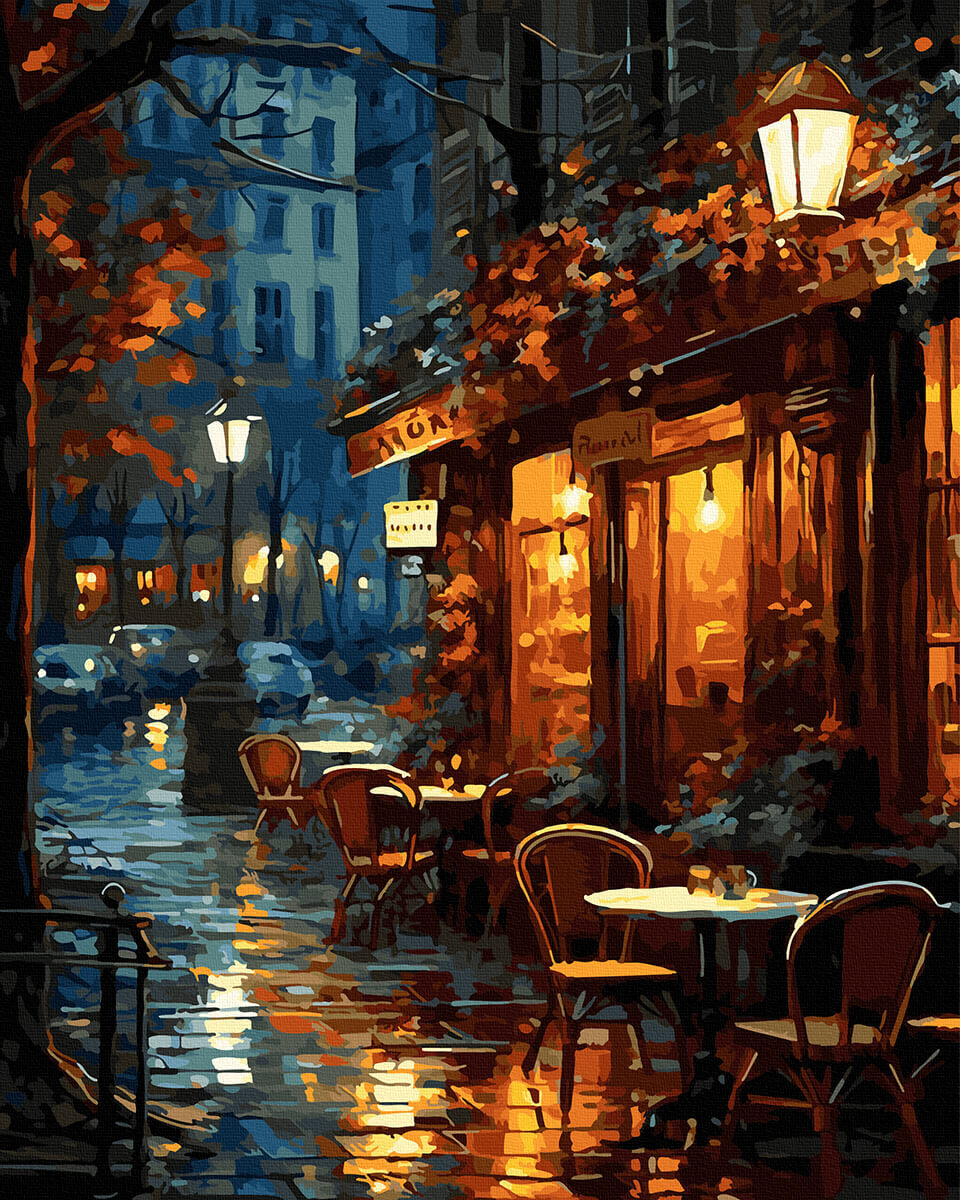 Deszcz w tym obrazie nie jest tylko tłem. To opowieść o blasku i ciszy, o ciepłej przestrzeni, w której można się zatrzymać. Malując Kawiarnia w deszczu po numerach, wchodzisz w świat miękkich refleksów, wilgotnego powietrza i zapachu świeżo parzonej kawy. Każde pociągnięcie pędzla to jak dźwięk deszczu na szybie – delikatny, rytmiczny, kojący.