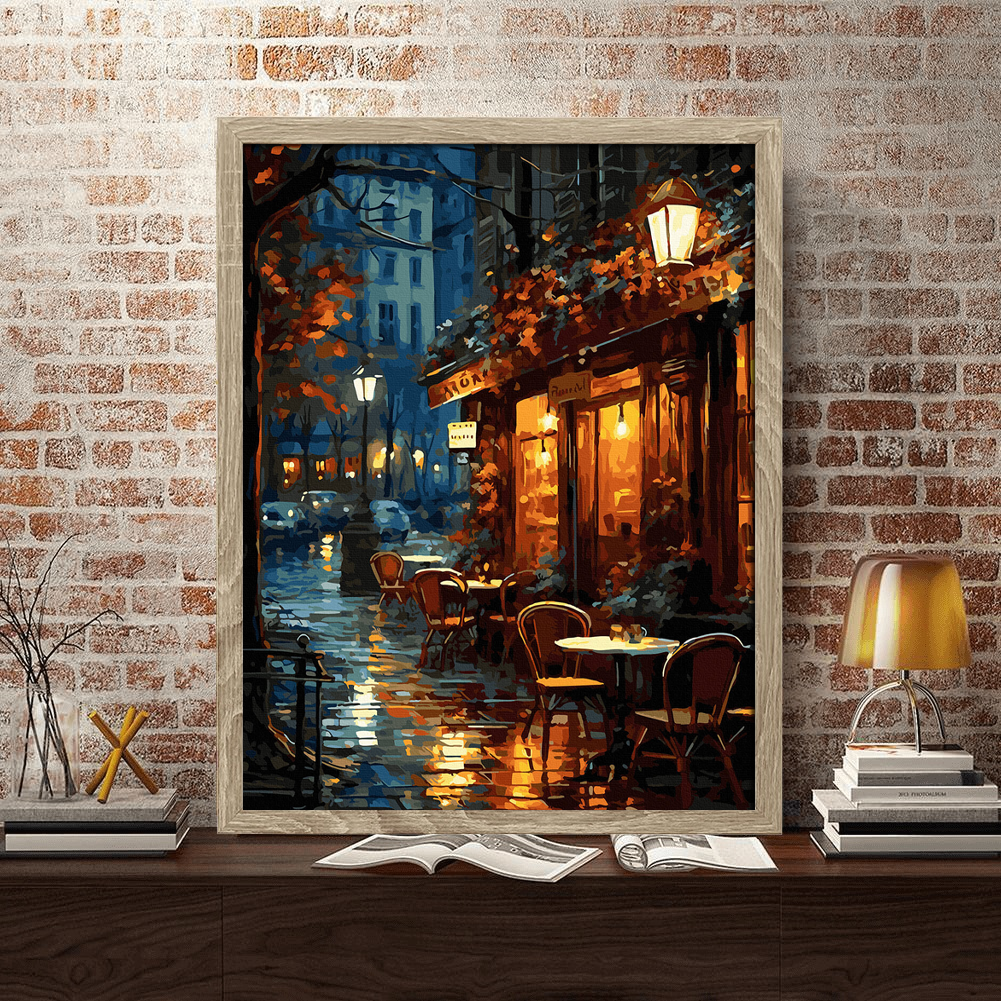 Kawiarnia w deszczu – emocje i światło w malowaniu po numerach krok po kroku